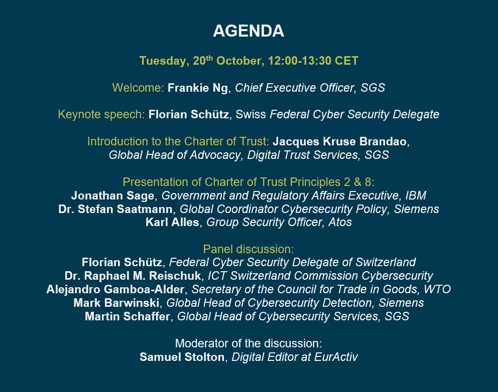 The virtual Geneva Roadshow will be introduced by Frankie Ng, CEO of SGS, who will underline the importance of the Charter of Trust and its raison d’être in an uncertain world. Florian Schütz, the Swiss Federal Cyber Security Delegate will hold a keynote speech on the Swiss Cybersecurity Strategy. Charter of Trust experts will focus on the Charter’s Principle 2 “Responsibility throughout the digital supply chain” and Principle 8 “Transparency and response”, highlighting how Charter of Trust members implement internal and external processes to strengthen cybersecurity.