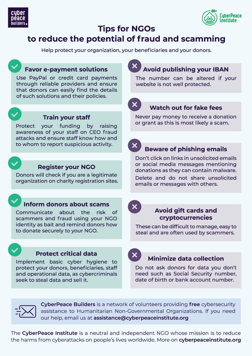 You will find below the CPI’s tips for NGOs to reduce the potential of fraud and scamming – to protect organizations, beneficiaries and donors.